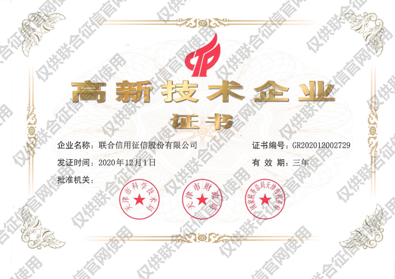 聯合征信獲評國家高新技術企業